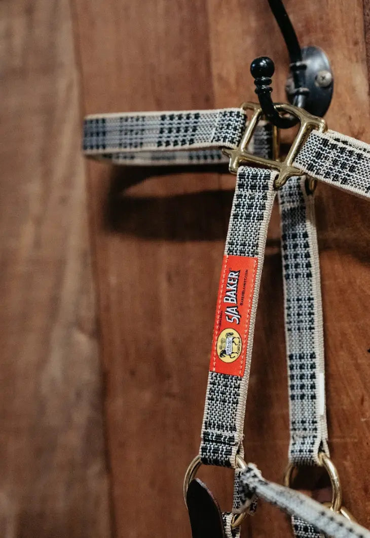 This quality halter is made from 1" wide polypropylene woven in Original Baker Plaid with the signature red tag with a 1" full leather crown piece and brass plated hardware.