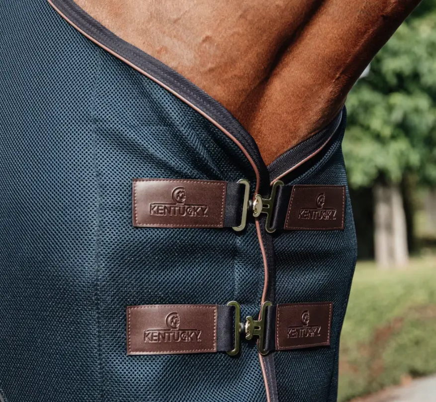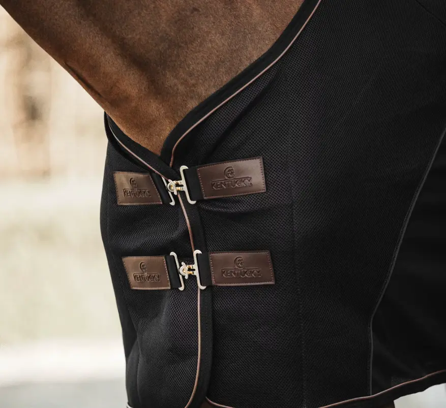 The cooler sheet is a combination of the Kentucky Horsewear fly sheet and the 3D spacer. Along the spine: the 3D spacer fabric - a light but strong honeycomb structure that absorbs sweat while keeping your horse dry. On the lower part: the Mesh fly sheet fabric does not only prevent bugs from bothering your horse but will also help air circulation. Which will gradually cool your horse down. The materials used for the Mesh Combo are specially designed, so hair doesn’t stick to it. which makes the cooler sheet very comfortable to wear in hot weather.