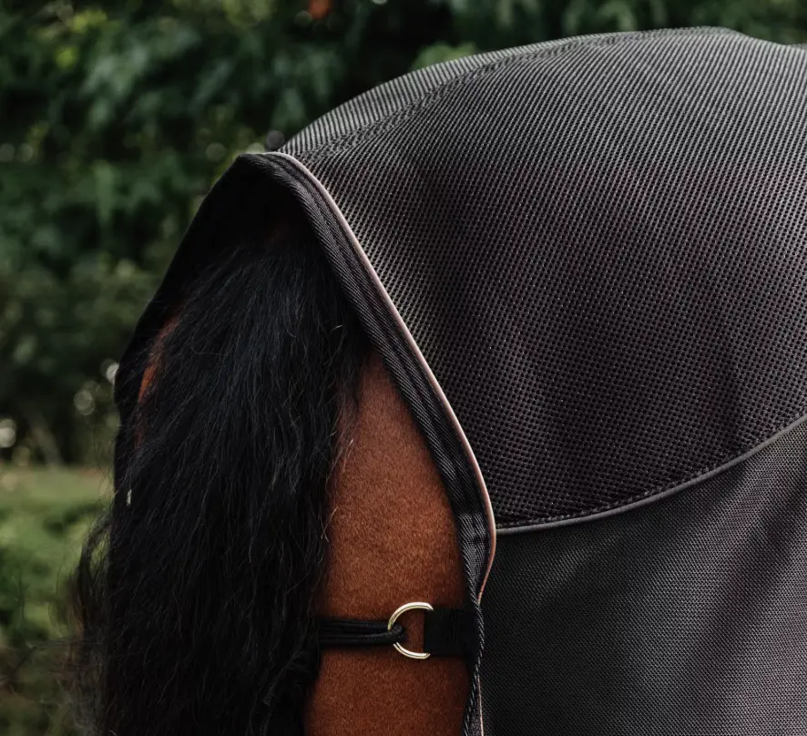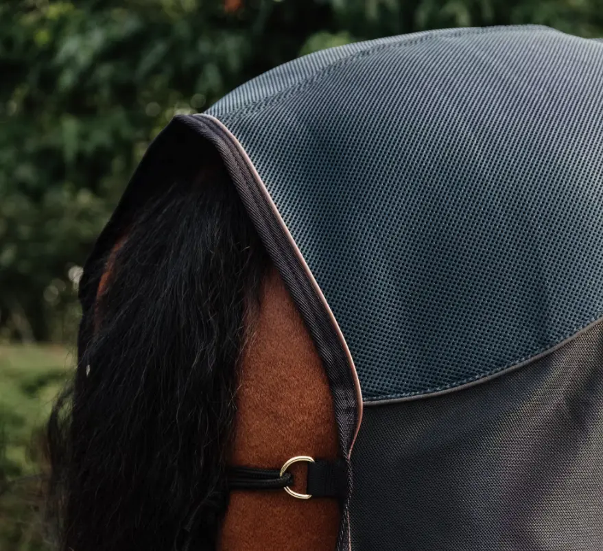 The rug is anatomically shaped at the back and has a flat-lined shoulder to make the rug fit nicely to the shape of the horse. For extra comfort, we added artificial sheepskin at the withers and removable surcingles. So, you can easily turn the rug into a showrug by removing the detachable surcingles. Additionally, we added our signature brown leather piping and the Kentucky logo in vegan leather for a luxurious look.