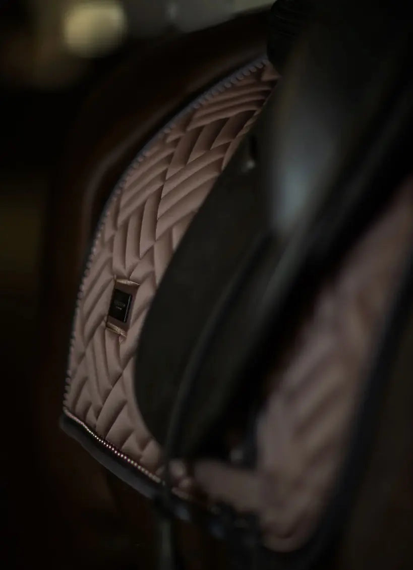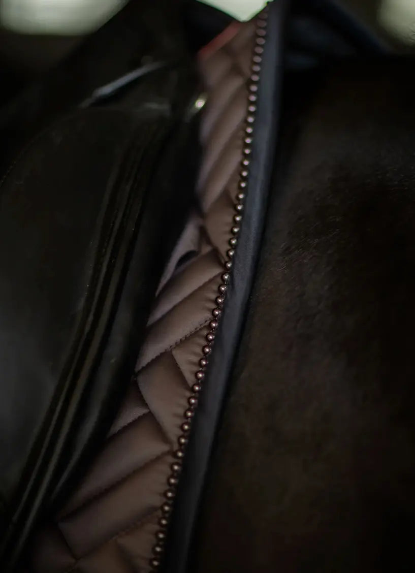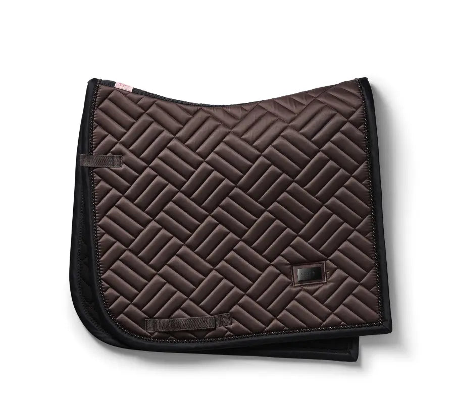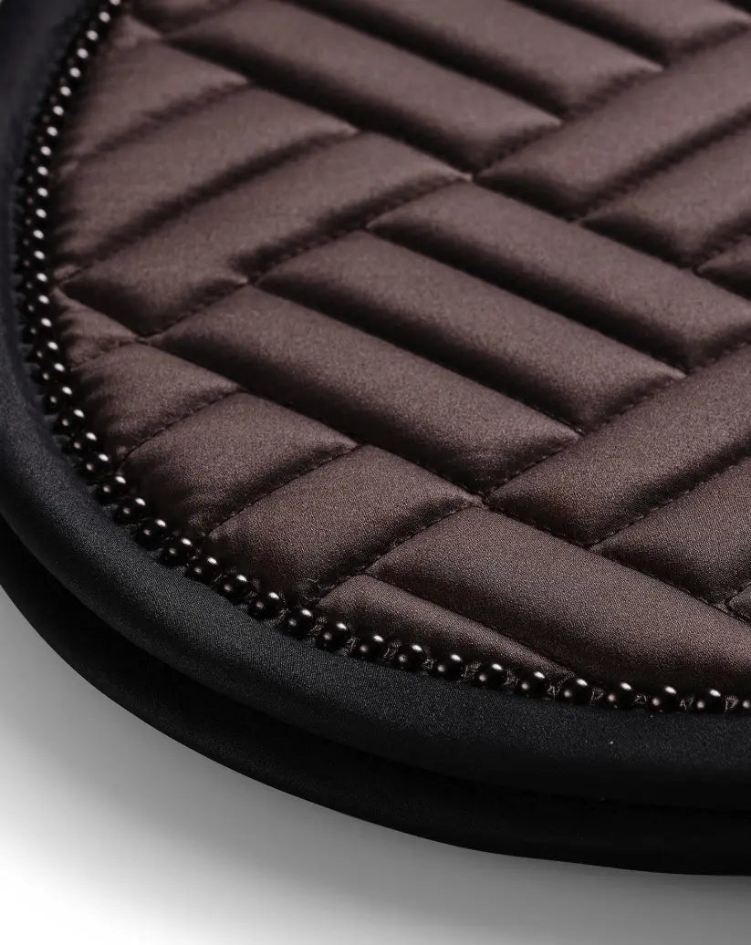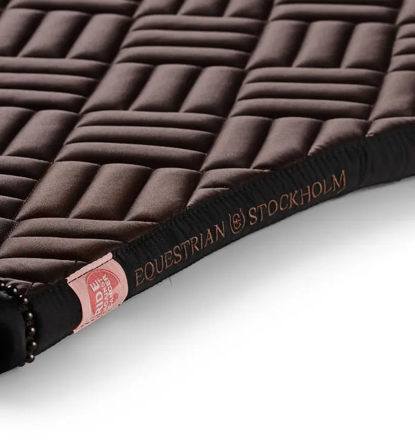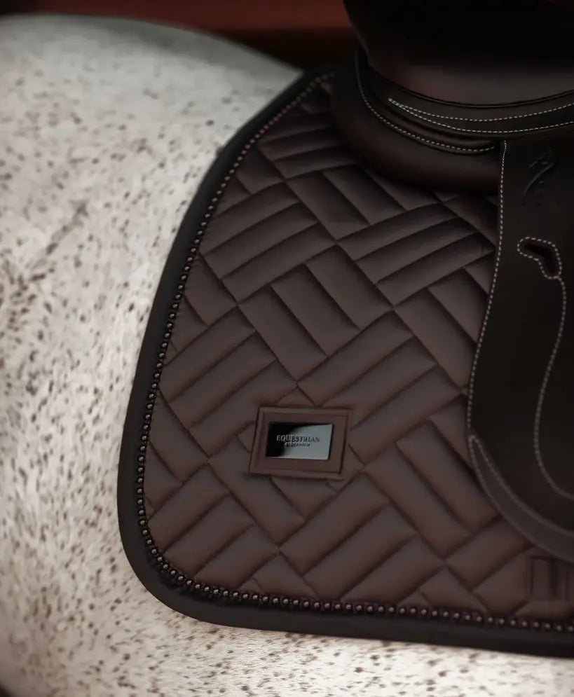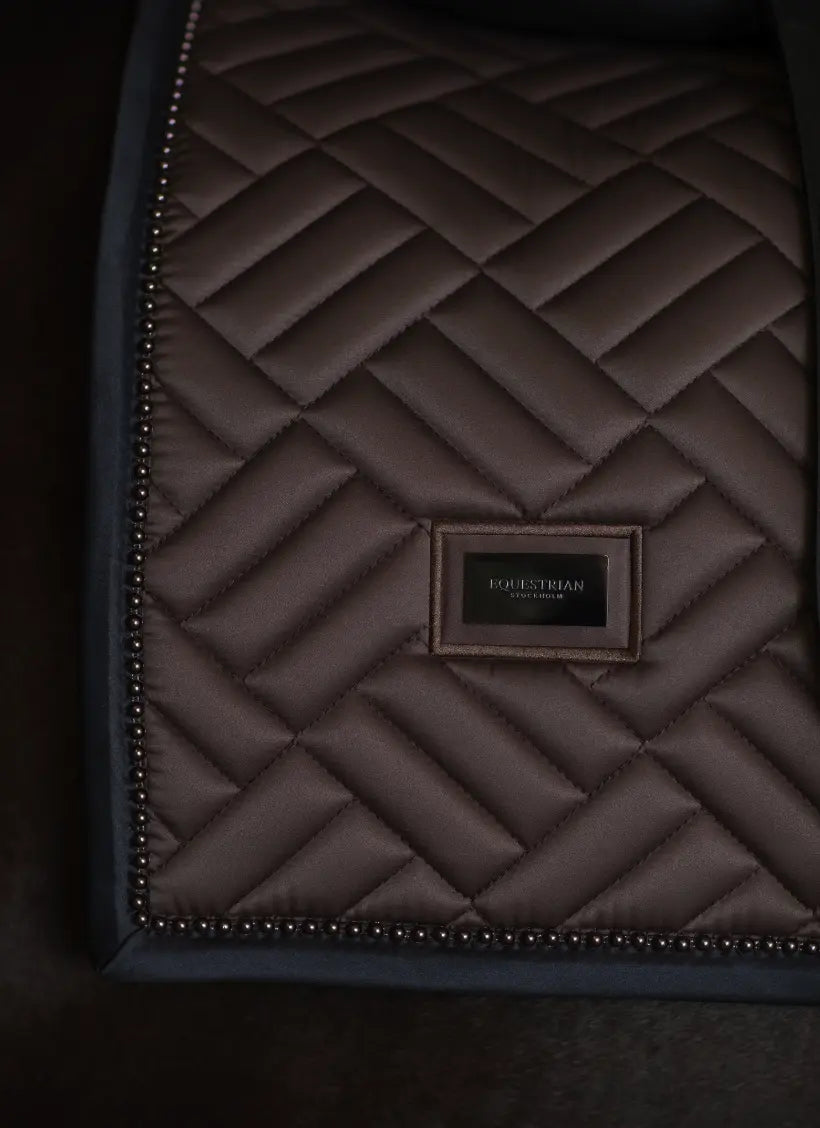 Equestrian Stockholm saddle pad with modern maze quilting in a rich, brilliant bmocha with tone on tone brown pearl trim. Decorated with the Equestrian Stockholm badge in silver. The bamboo material is perfect all year round due to its thermal regulating effect - cooling in the summer and warming in the winter. It is also quick dry, moisture wicking, and anti-bacterial. Style with other pieces from the Bordeaux collection for a head-to-toe stylish look.