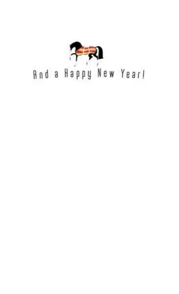 Inside: And a Happy New Year! Boxed Christmas cards: 8 cards, 8 envelopes in a clear-cover stationery box held closed with a gold stretchy corded ribbon. Gold sticker label on the back contains what is written on the inside of each card. Card stock is 12 pt coated one side. Envelopes are white Leader envelopes.Â