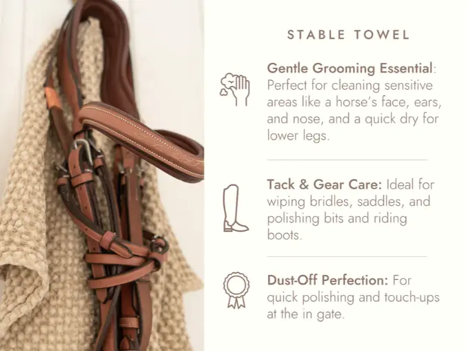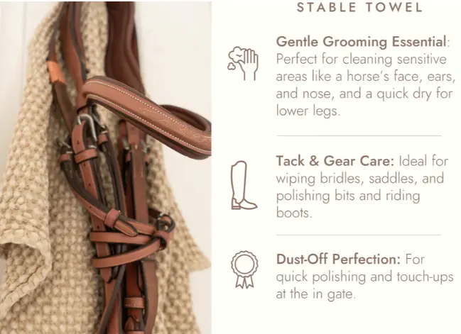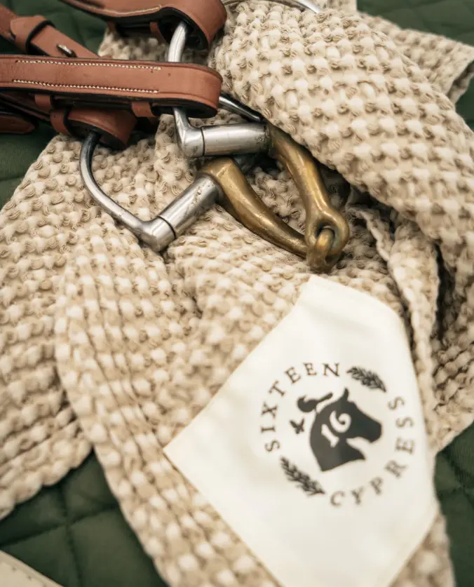The ultimate barn essential: our smaller-sized 100% cotton waffle towel. Designed for versatility, this towel is perfect for drying and grooming your horse, from wiping down faces and ears to adding a polished finish to show boots and cleaning tack. The soft waffle texture offers superior absorption and gentle care, making it an indispensable part of your grooming kit. Whether you’re at home or on the go, this towel combines functionality with the refined style you expect from Sixteen Cypress.