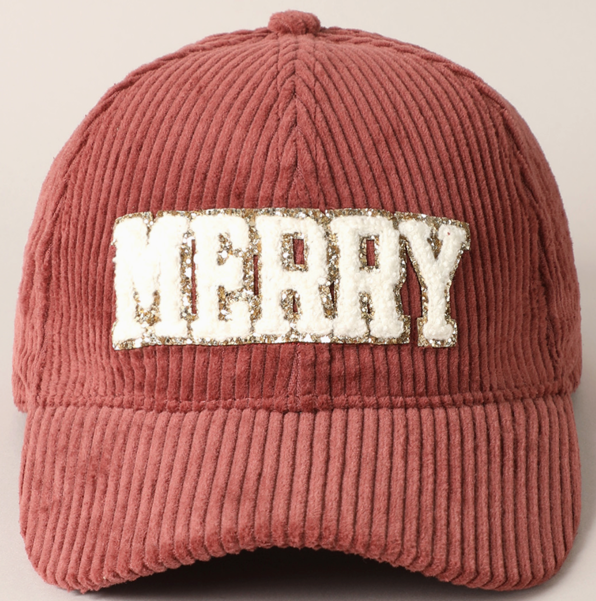 "Merry" White terry and glitter letters on bordeaux wide corduroy hat. 100% cotton with adjustable tab.