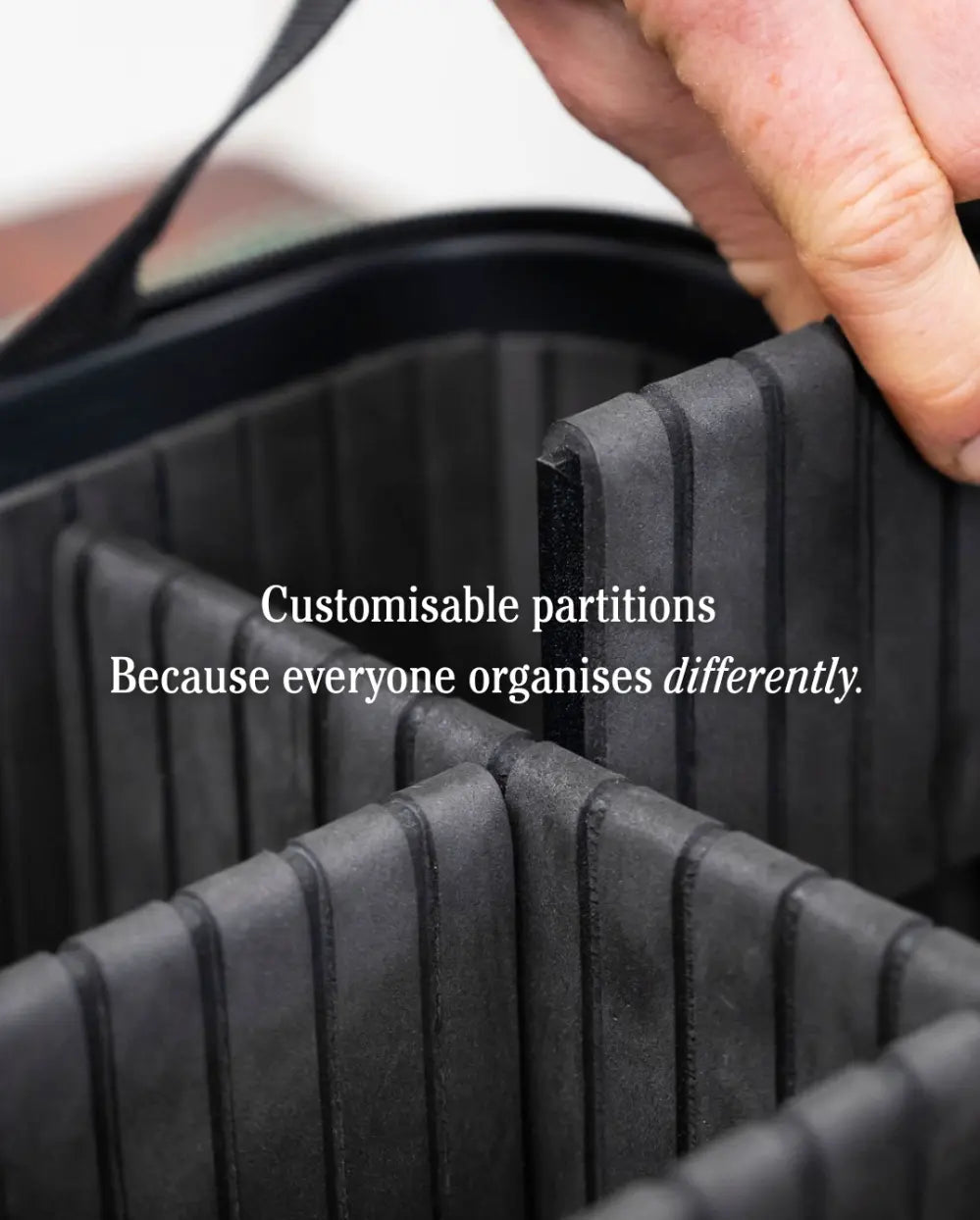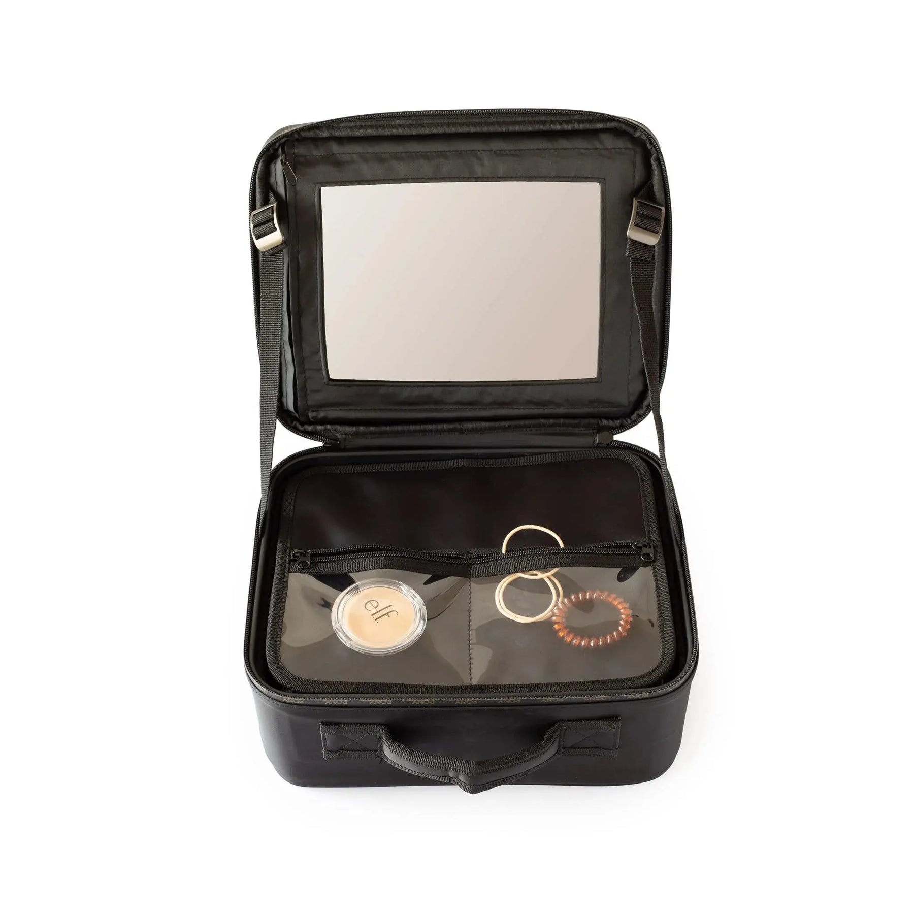 The designated storage case features a built-in mirror, an inn er cover with clear pockets, and customizable partitions so you can easily arrange your items exactly how you like them .