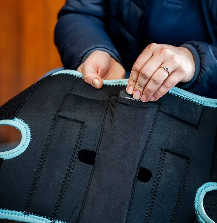 The gel bead liners wrap around the knee to provide targeted cooling or warming therapy, while the outer boot contains integrated massage panels. Stretchy pockets allow for easy insertion and removal of the panels, and secure Velcro fastenings ensure a snug fit that stays in place.