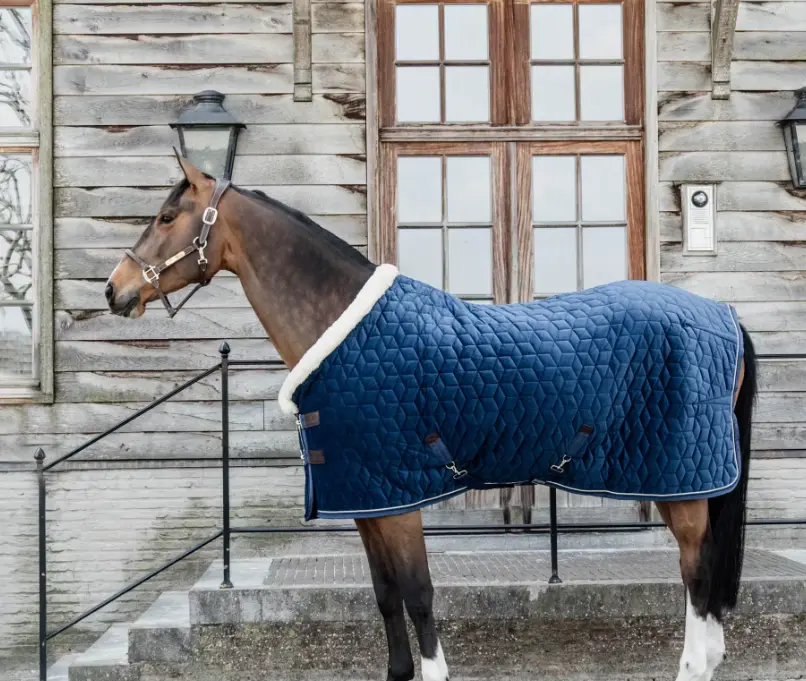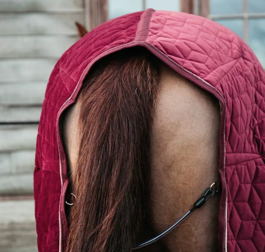 Made with an innovative and lush velvet outer fabric that resists stains, hay, shavings and a vegan rabbit skin inner lining that avoids rubs, and creates tiny air pockets to keep horse ventilated and warm. The cube quilt pattern resists tears and wear. 160g fiberfill weight - perfect for transport, show and stable. Cozy rabbit fur collar, vegan leather and brass fittings, and wipeable bungee tail cord.Features:
