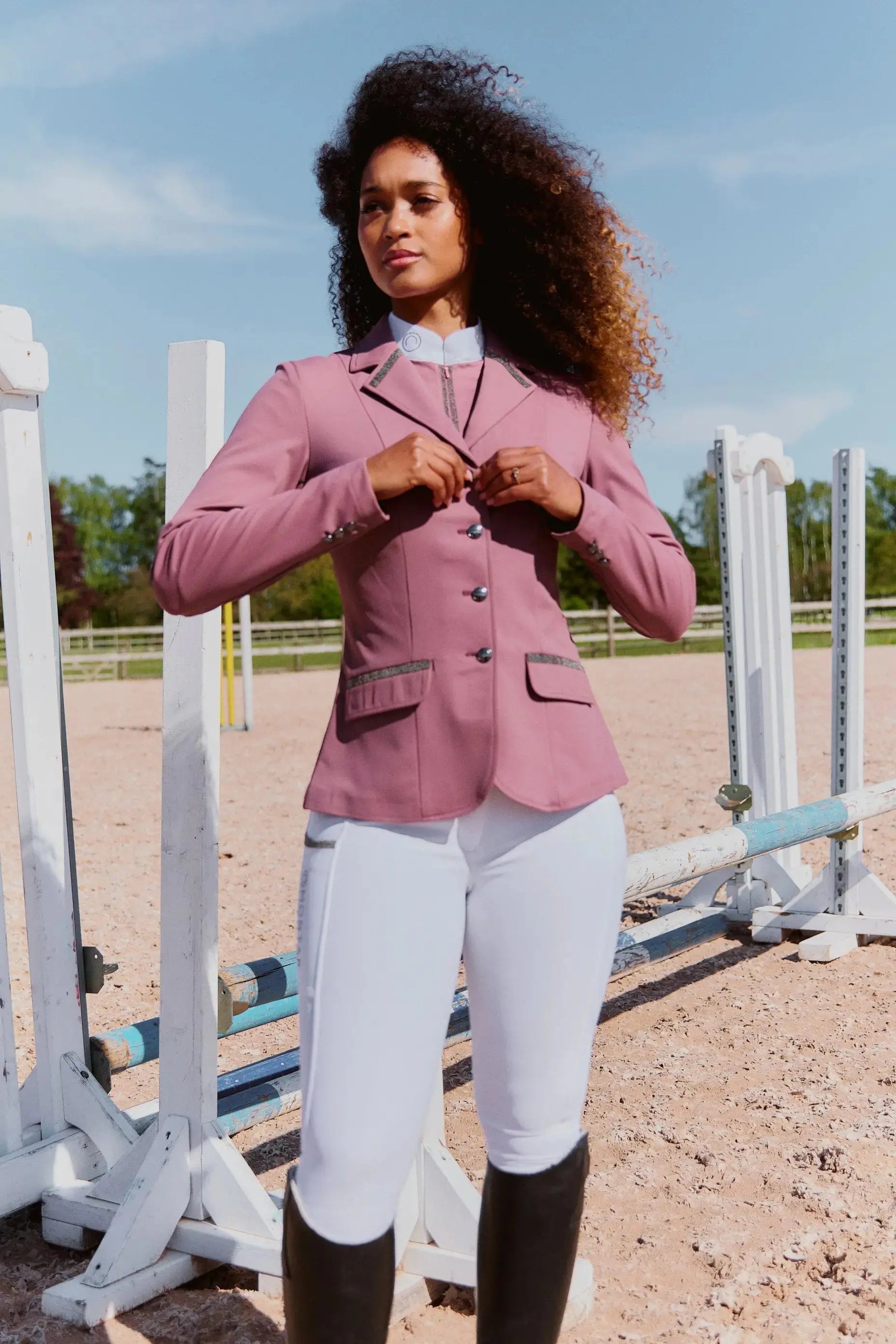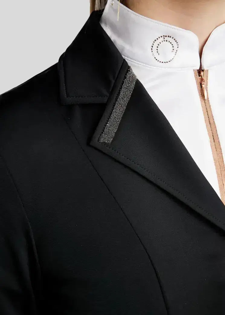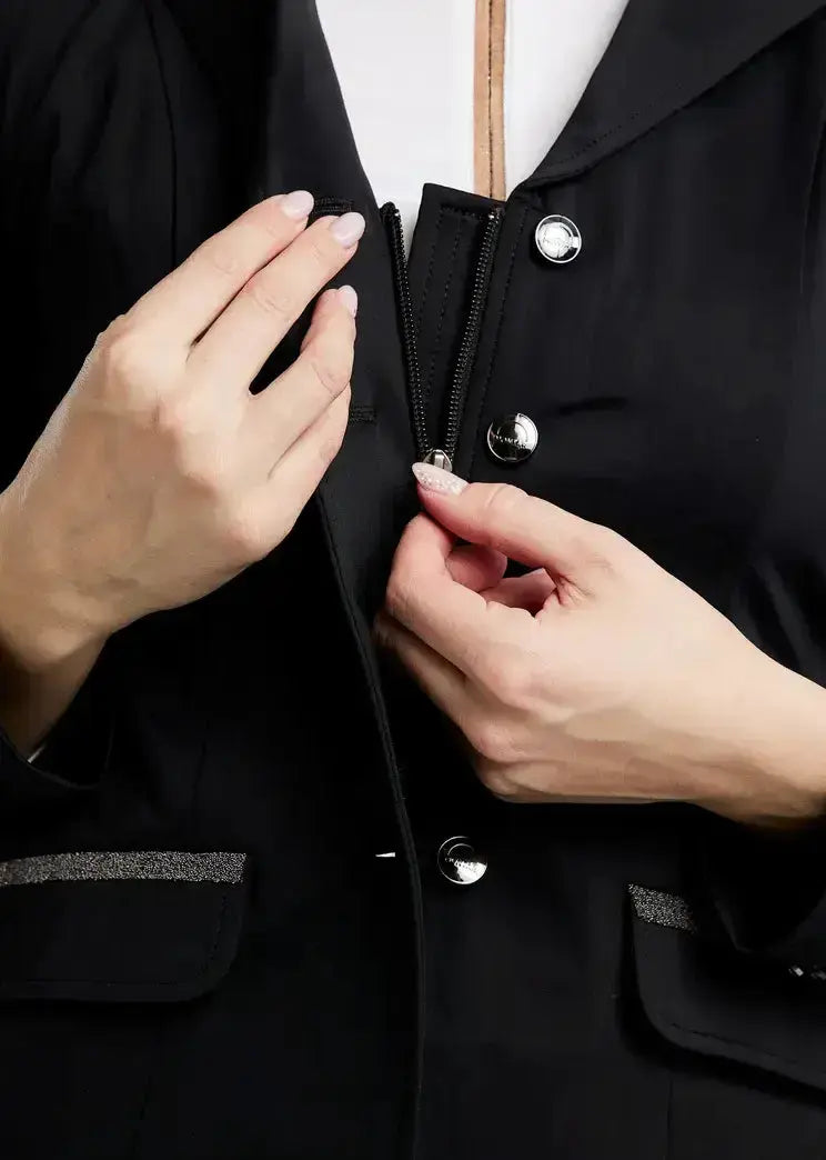 The MoGloria Gunmetal Caviar Crystal Show Coat is a sophisticated and stylish show jacket that combines luxurious details with practical functionality. Can be worn in the jumper and dressage rings for comfortable, high performance style.