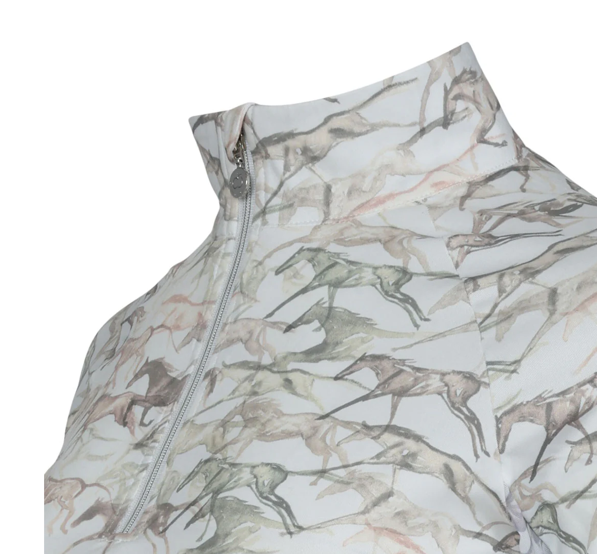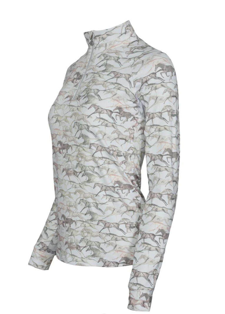 The elegant and artful galloping watercolor horses in a hand painted design on a premium 1/4 Zip top - Crafted from a perfectly light, feather-weight fabric with an incredible 'ice feel', this equestrian sun shirt offers superior protection in warm temperatures or serves as a comfortable layering piece when the weather cools. Designed true to size and elegantly fitted, its longer length ensures it stays neatly tucked into your breeches for a polished look in the saddle and beyond.