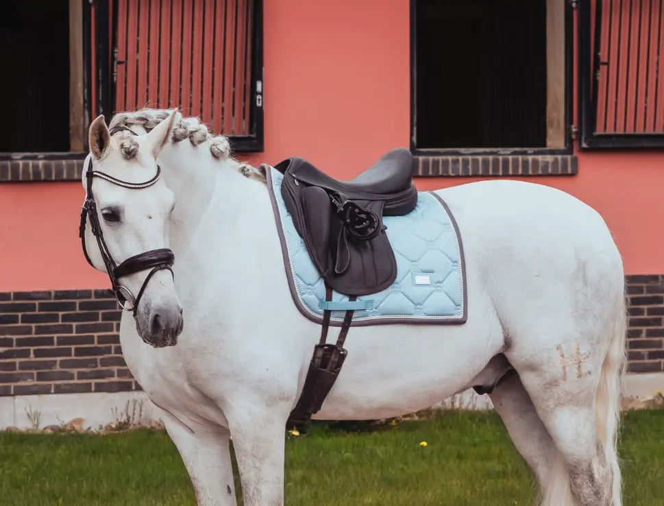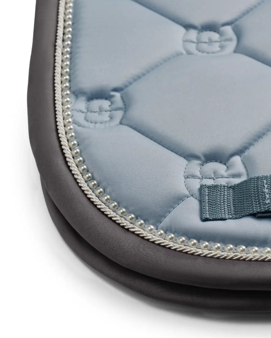 Beautiful dressage saddle pad in the classic quilt in ice blue color with shiny grey and creme white details, plus an inlay string of creme white pearls at the trim . . Crafted in a glossy, dirt resistant material that breathes well and keeps your horse dry throughout sweaty sessions. The inner lining contains bamboo which has antibacterial qualities and keeps the saddle pad fresh longer.