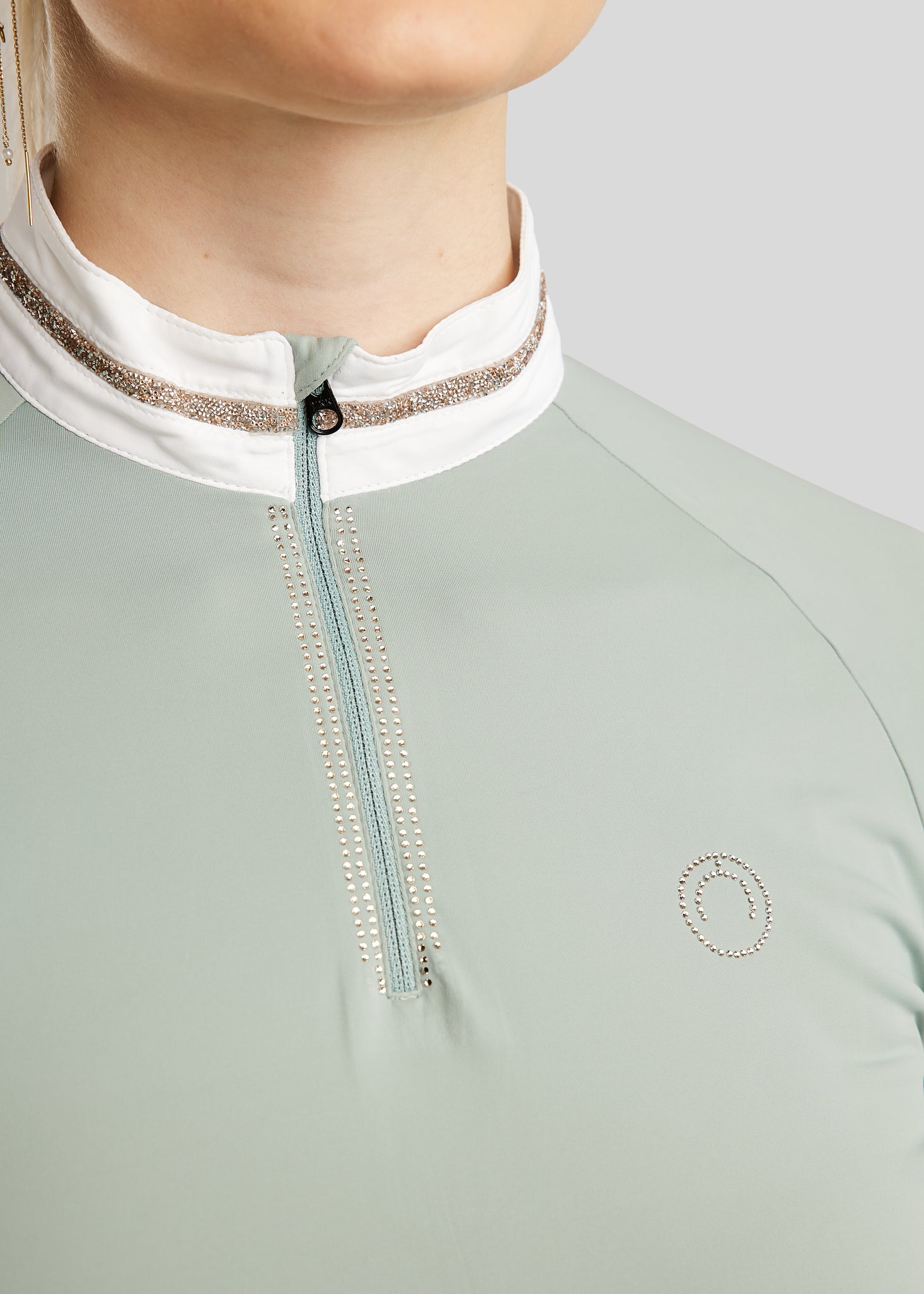Elegant and Exclusive Design: Beautiful champagne-colored crystal details give the shirt a luxurious and elegant look. A delicate champagne crystal tape runs around the collar, adding an exclusive finish, while two rows of champagne crystals along the zipper catch the light beautifully. On the chest, a discreet Montar logo in matching champagne crystals completes the elegant and feminine design. Functional and Modern Look: The lightweight and breathable fabric ensures maximum comfort, even under pressure. The front zipper makes the shirt easy to take on and off, and the close fit highlights the feminine silhouette while allowing full freedom of movement. The MoLila shirt is perfect for riders who want to combine style, comfort, and performance in one design. Technical and Comfortable Fabric: The MoLila competition shirt is made from a technical material that combines breathability, elasticity, and comfort. The fabric moves with your body to ensure optimal freedom of movement, whether you’re riding or preparing in the arena. Material: 90% Polyamide, 10% Elastane