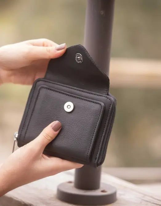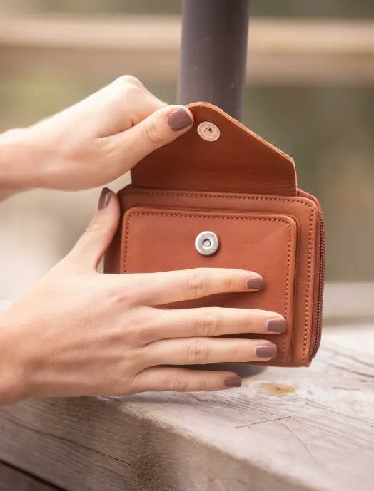 The Clémence leather wallet from the Pénélope Collections features a zippered compartment for coins with four card slots, and a second snap-closure compartment with two additional card slots and a transparent plastic window for photos or small documents. The flap of this compartment is made from glitter leather.