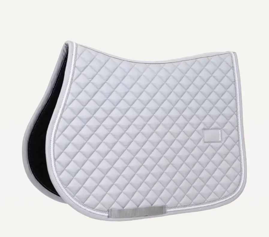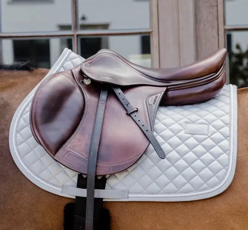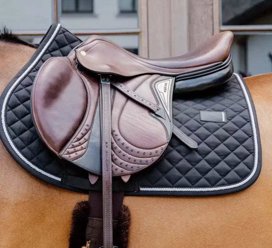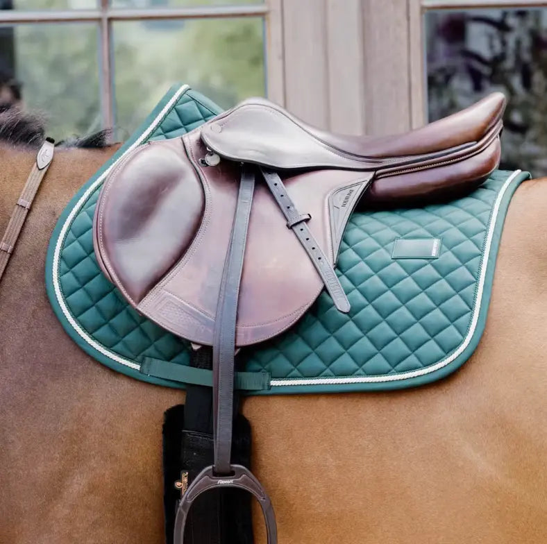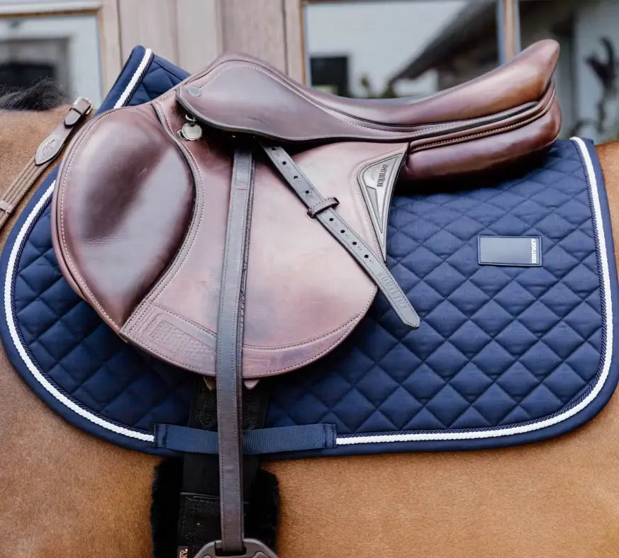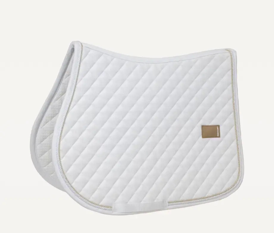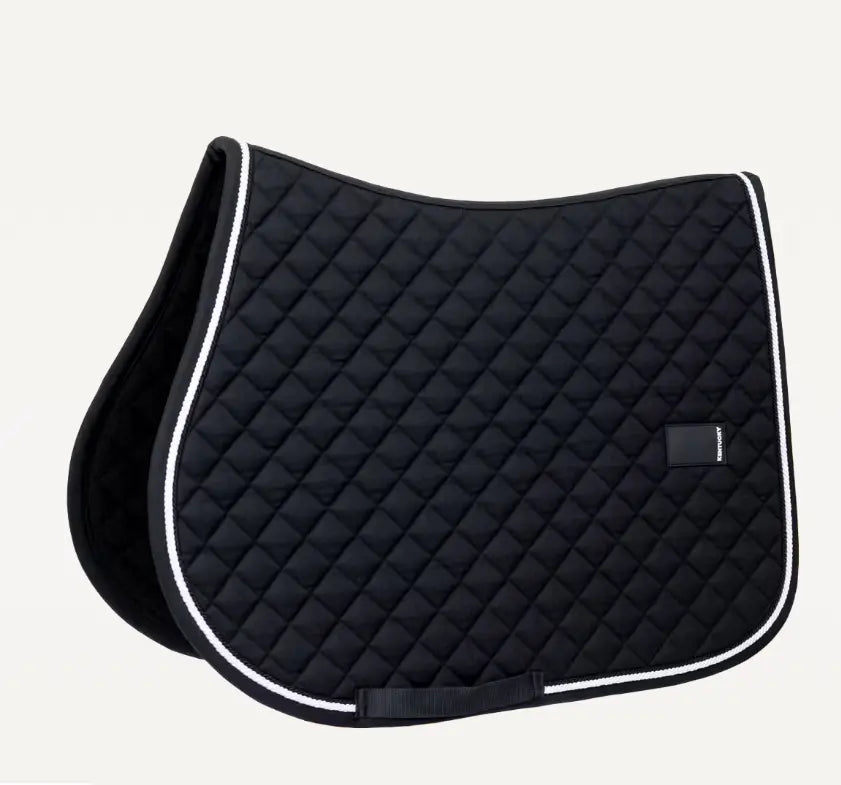 Crafted from a moisture-wicking and quick-drying cotton-polyester blend, this saddle pad ensures your horse stays comfortable even during intense training sessions. The inner padding is breathable, providing effective cushioning between the saddle and your horse’s back. The stitched Kentucky logo, made from premium rubber, showcases Kentucky quality from afar. Enjoy quick and hassle-free tack-up with no annoying girth loops Prevents heat build-up with fast-drying, highly breathable materials Ride with confidence thanks to an anatomical fit that ensures zero slipping With its striking border, the classic-styled Saddle Pad Diamond adds a touch of elegance to your horse. Its exclusive design catches the eye, whether you’re training or competing. Perfectly match it with a fly veil for a refined look. Additionally, it offers ample space for custom embroidery, allowing you to add a personal touch. Designed to perfectly fit your horse’s back, this anatomically shaped saddle pad alleviates wither pressure and ensures no slipping, pressing, or rubbing. Enjoy a secure, comfortable ride that enhances your confidence and control. Choose from six modern yet timeless colors, available in both jumping and dressage styles for versatile use.Features: