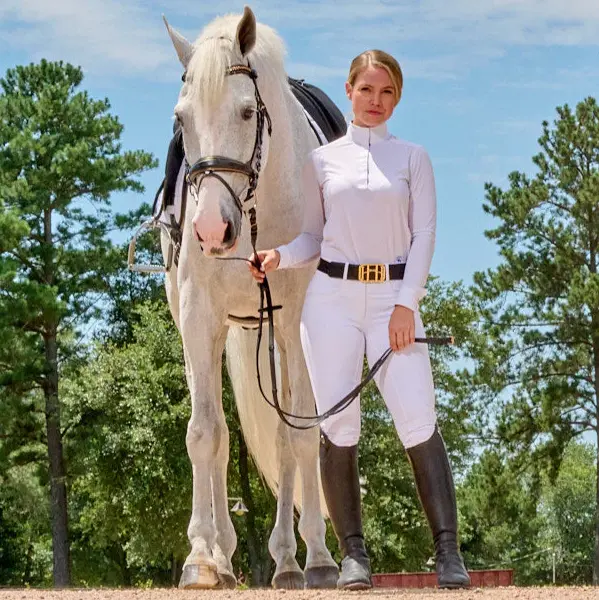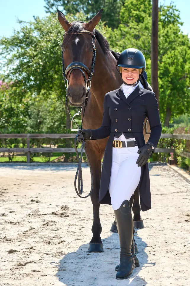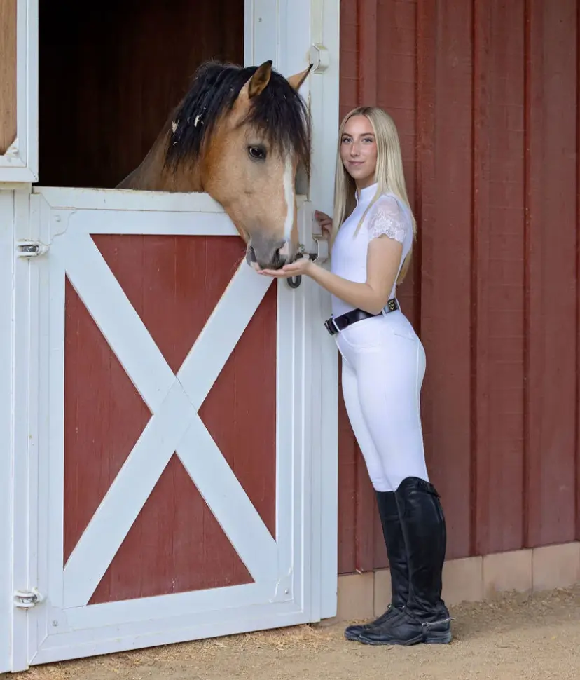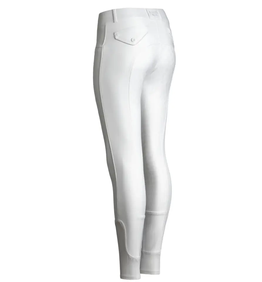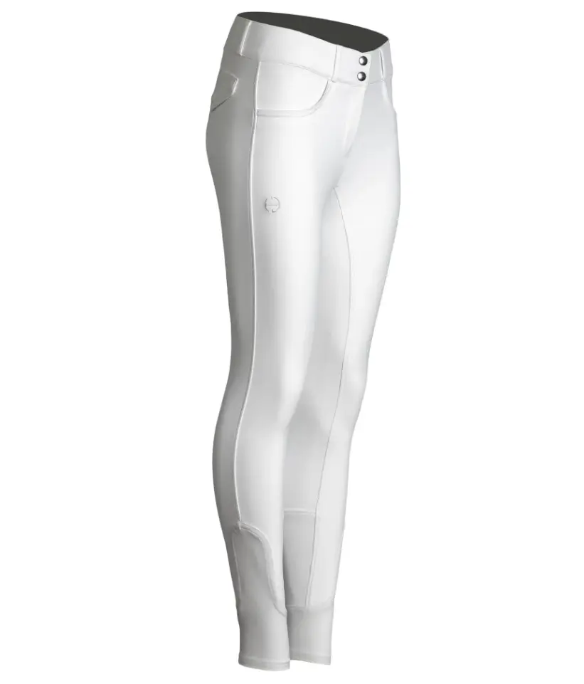 The design features a unique and slimming 9" mid-rise that hits under the belly button, just under the natural waist, with a 2" waistband, slightly higher in the rear- the breeches stay perfectly in place. The silicone grip inside the waistband to keeps your shirt tucked in, and silicone logo grip on the seat adds the perfect amount of grip in the saddle without being too "sticky" - The embroidered logo, piping and trim add the perfect amount of subtle and chic detailing to keep you looking fashionable in and out of the saddle!