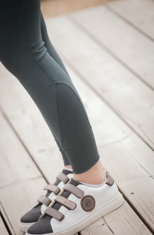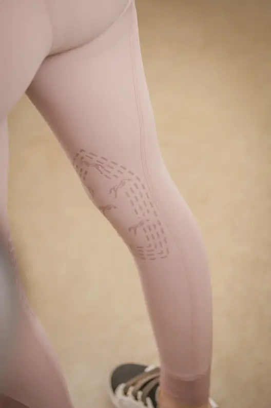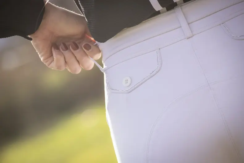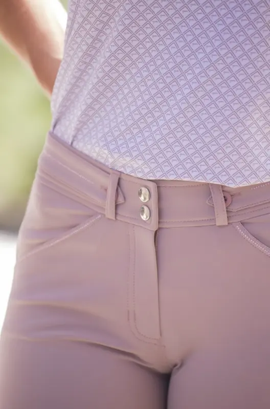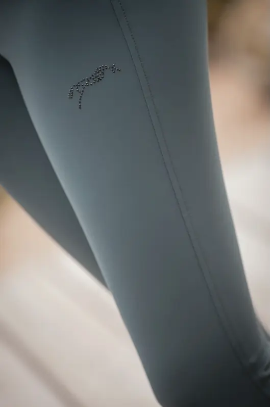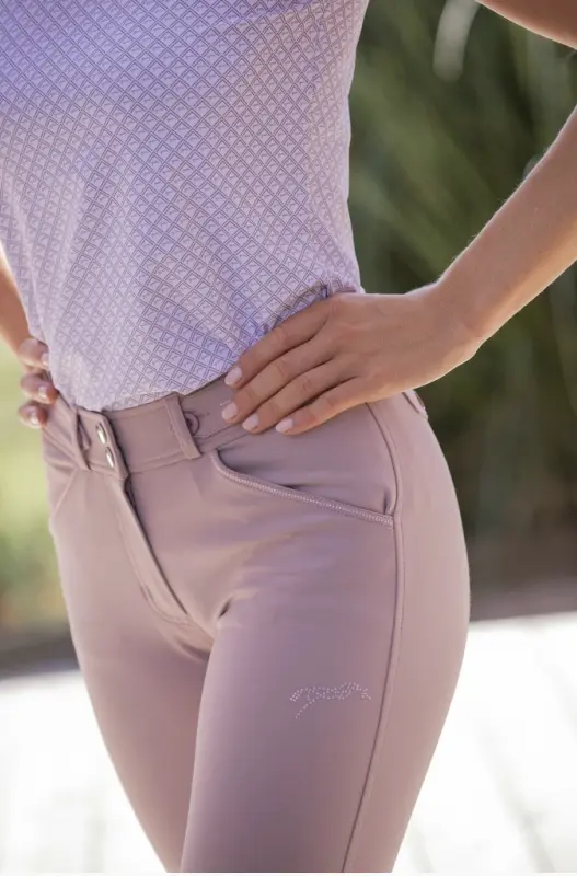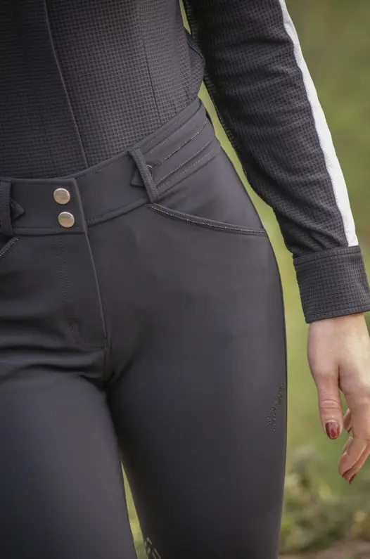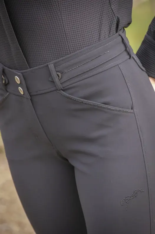 The Élégance Breeches feature a slightly higher rise than the Penelope Majestic / Rocky's, with the same 4 way stretch flattering fit for all body types. The waistband features an outer integrated belt detail, though also accommodates up to a 2" wide belt of your choosing. Two front pockets plus an Inconspicuous small phone pocket with a slim zipper is located on the right leg. Faux button patch pockets flatter the rear. And a row of rhinestones on the waistband and along the front and back pockets. A little Penelope horse, also in rhinestones, sits in the middle of the left thigh. These comfortable stretch breeches have non-slip reinforcements on the inside of the knees and a slightly high, close-fitting waist. The lower leg is made from Lycra to adapt to a wide range of body shapes. A very pretty, feminine piece that is comfortable to wear and sure to cause a sensation at the stables.