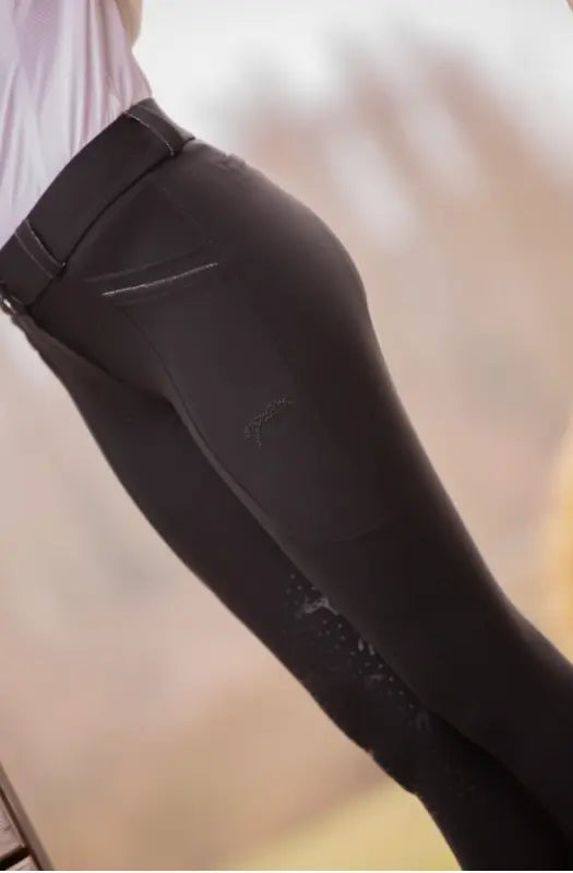 The Sybille riding breeches feature a mid high waist, similar to the Elegance breech, now with two large front phone pockets. Very discreet, a small rhinestone Pénélope horse is placed on the middle of the left thigh and subtle glitter details along the pockets and belt loops.
