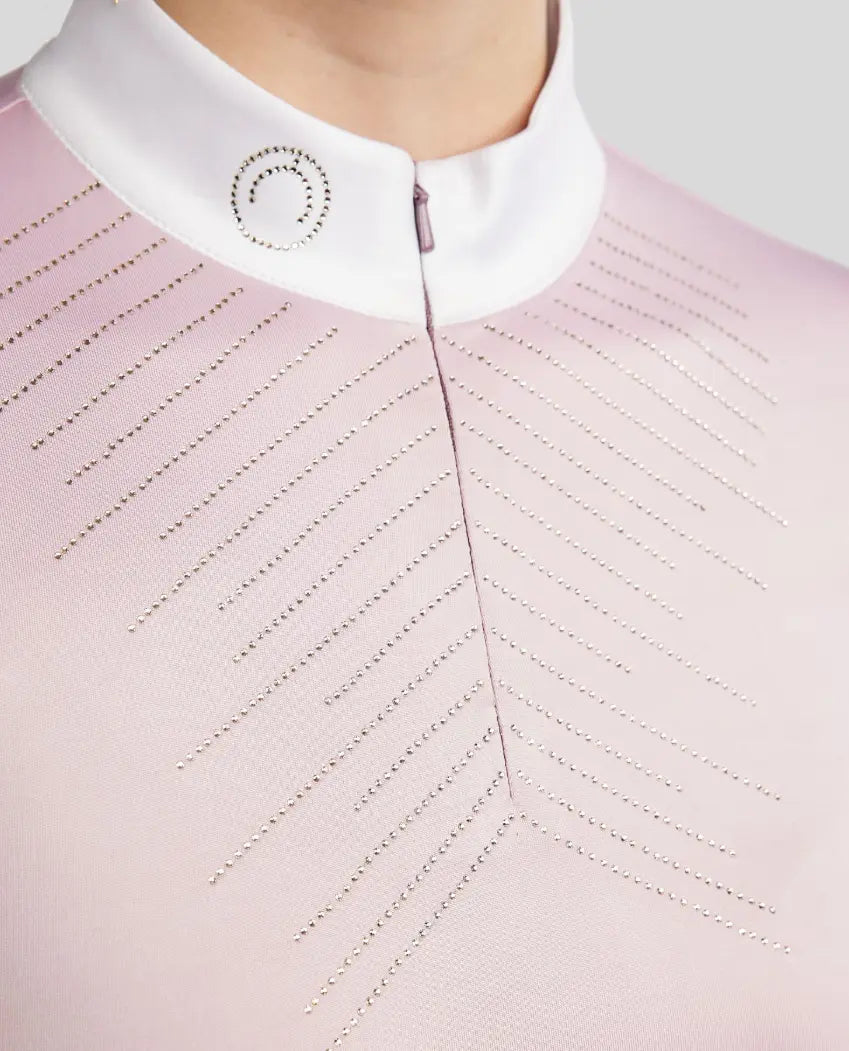 This feminine and stylish show shirt combines a classic, clean expression with luxurious crystal details and high comfort. It is perfect for riders who want an exclusive and eye-catching look.Elegant and Exclusive Design: The show shirt is decorated with beautiful champagne-colored crystals, placed in flattering rows from the collar down across the chest. These sparkling details add a luxurious and feminine look. Inside the collar, you’ll also find a delicate Montar logo crafted from the same champagne-colored crystals, completing the exclusive finish.Functional Details: