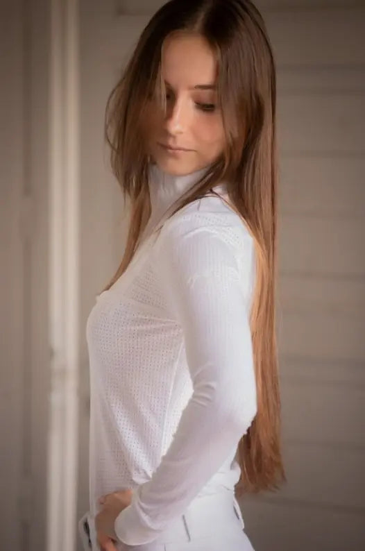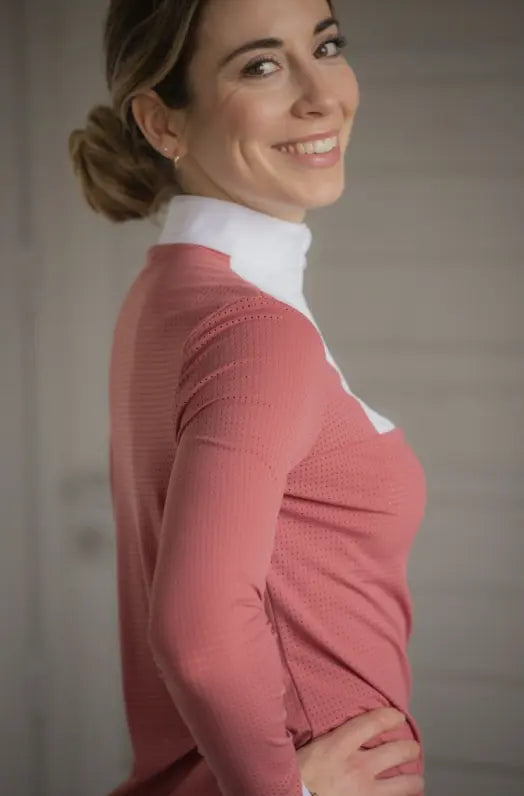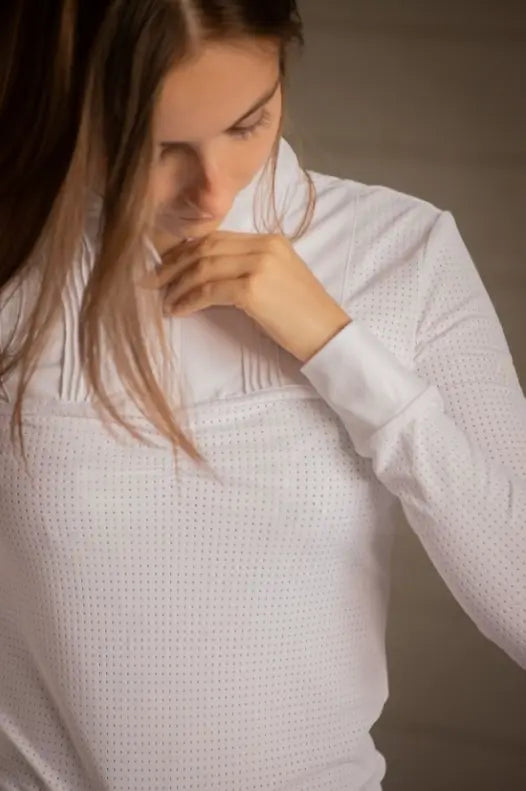 Your perfect new bibbed show shirt - a perfect mix of high performance, perforated 4-way stretch, and a beautiful stand up collar with pleated bib, hidden zipper. The delicate front pleat allows for the fabric to stretch and fall femininely for all chest sizes without over stretching or gapping. A white tone on tone Pénélope logo appears on the left shoulder. The top offers a comfortable fit perfect for hotter days under a show coat and airvest. Beautiful construction that performs.
