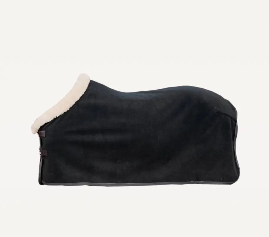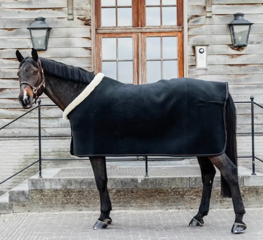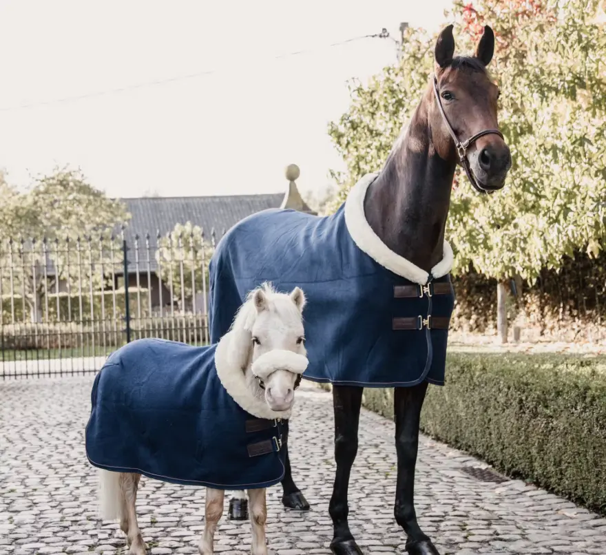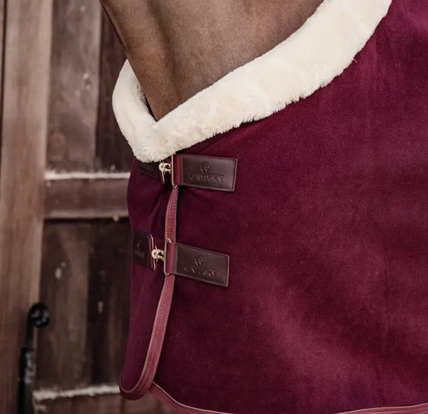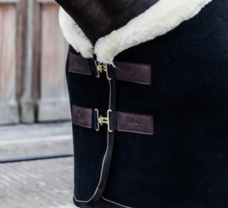 Fabric & materials The rug is highly absorbent and quickly wicks away sweat or water. The entire neck and chest are covered with vegan sheepskin, which not only provides warmth but also adds comfort. The rug is finished with vegan leather piping and elegant front closures.Shape & size The Kentucky Fleece Show Rug Heavy is thoughtfully designed with two internal detachable surcingles equipped with clips, making it adaptable for different uses, including as a show rug. This flexibility allows for a custom fit tailored to the specific needs of your horse, ensuring the rug stays securely in place without shifting.Care guide Maintaining this rug is straightforward: it is machine washable at a gentle 30° cycle to preserve its fibers and detailing. To ensure longevity and performance, avoid using a dryer.
