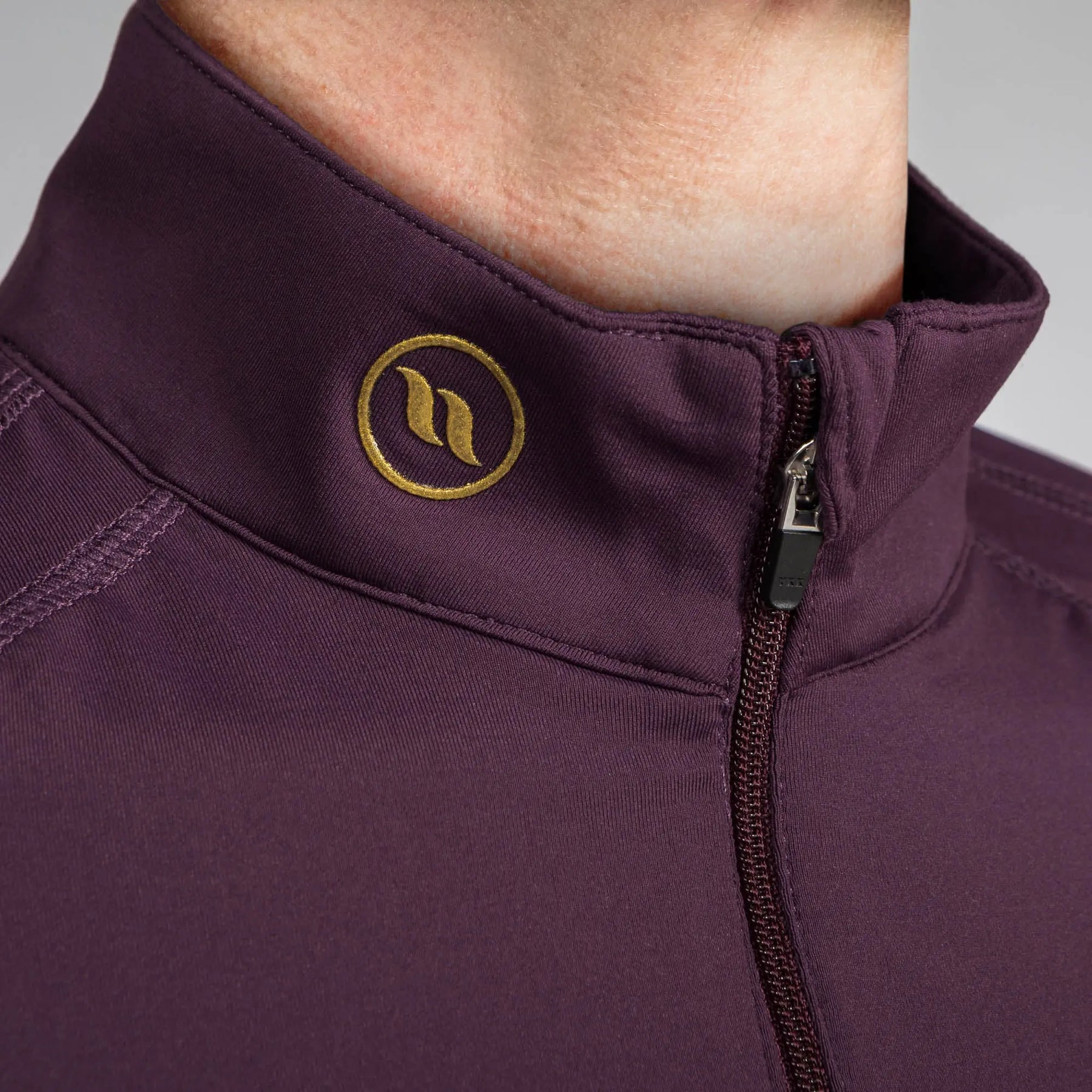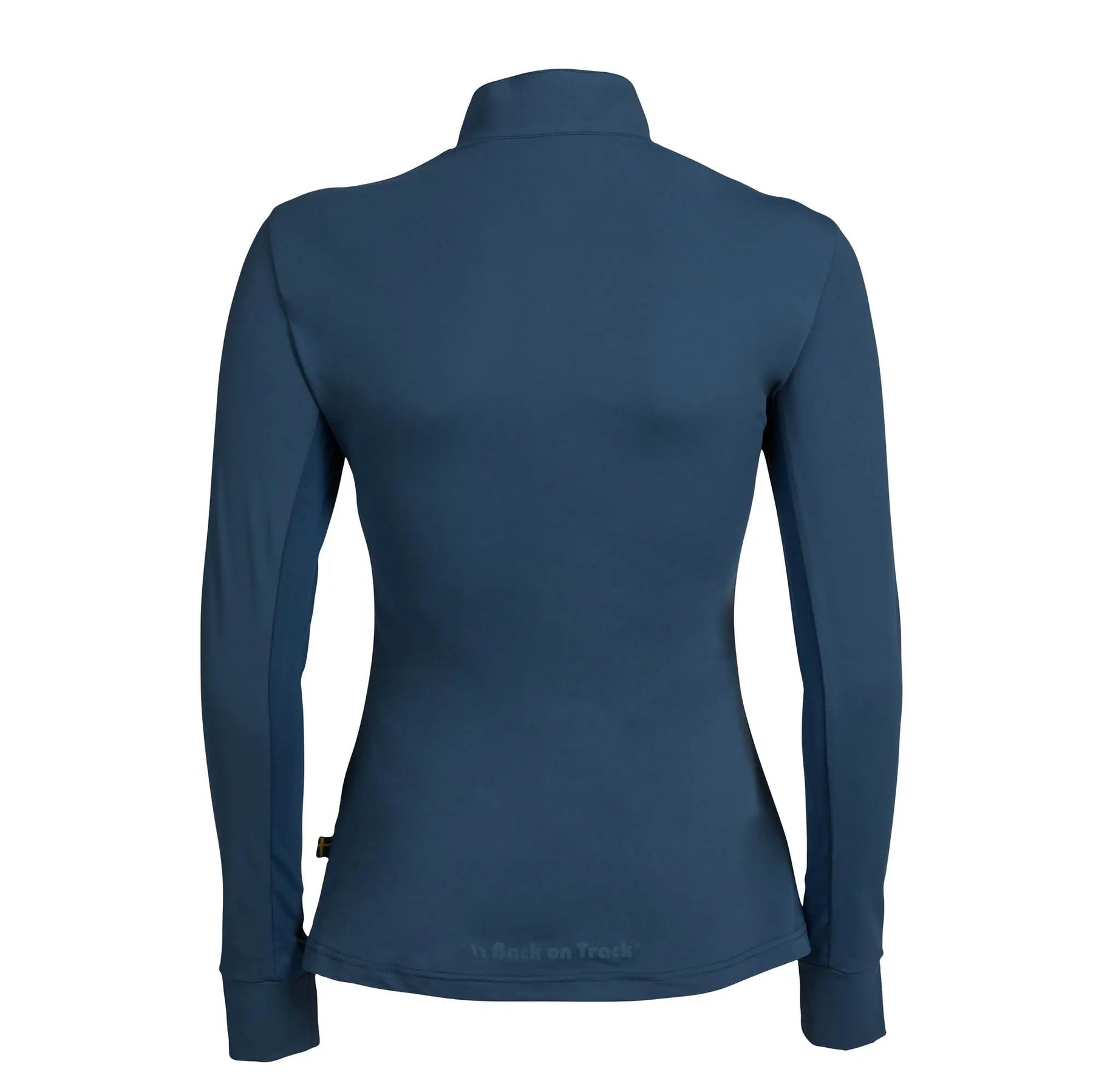 The Agnez long-sleeve women’s shirts are a form-fitting minimalist top with a structured stand-up collar, adorned with a discrete Back on Track wing emblem in matte gold. Agnez has a sleek, classic look, with a half-zip closure made from a lightweight functional fabric, which is highly breathable, wicks away moisture and dries quickly.