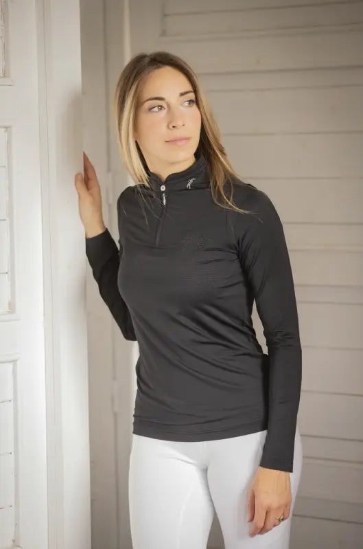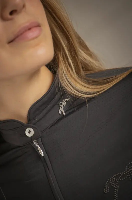 The Techpy Long Sleeve Riding Polo is designed to fit close to the body thanks to its ultra-stretch, highly comfortable fabric. This technical material ensures maximum comfort whether you’re riding or practicing other sports. It’s perfect for training, to be worn alone in mild weather or as a base layer in colder conditions. The polo features a small stand-up collar with a discreet zip closure topped by a small button. Its look is reminiscent of a show polo, but this time without the traditional white collar—instead, it has a sleek black tone-on-tone collar for a very elegant touch. Two stretch inserts at the armholes enhance the garment’s comfort even further.
