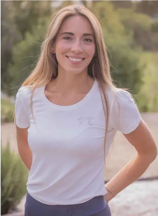 The perfect staple in a high performance, sweat wicking honeycomb perforated fabric.  Details include princess sleeves, a flattering u shaped neck detail and sparkly tone on tone Penelope logo design on the left chest.  A tone on tone Pénélope logo appears on the left shoulder.  The top offers a looser, comfortable fit perfect for hotter days or as a base layer.  Beautiful construction that performs and stylish enough to wear from barn to street.
