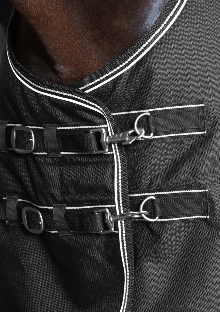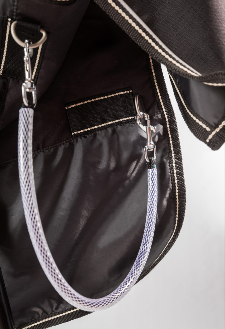 Perfect for cool weather and rainy days! Brianna is a high-quality turnout sheet that is durable, waterproof, and breathable. A versatile turnout sheet for fluctuating temperatures in changing seasons. Can be worn alone or layered over the Mille Stable Blsnket to add extra warmth on colder days. High shoulder gussets give the horse good mobility. Brianna is designed with a high neck and a large tail cover for extra protection. Lining over the shoulders, mane, and tail avoids chafing. The tail strap has a plastic cover that makes it easy to keep clean. The Knitted Lined Brianna is particularly nice for horses that are body clipped, while the Woven Lined Brianna is great for all coats, clipped or not.