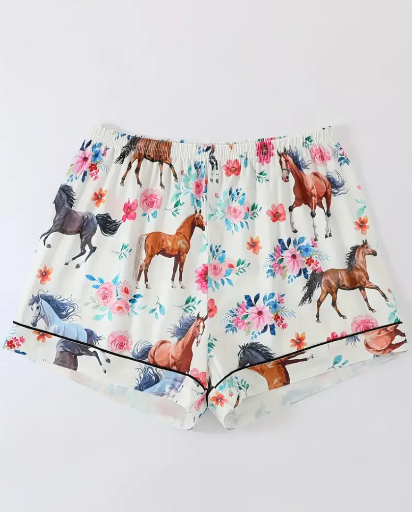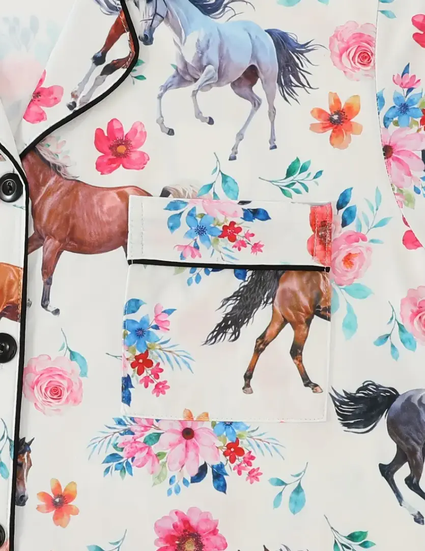 This three piece set includes a front button plackard top, room full length bottons and sleep shorts adored with pink and blue flowers and cute ponies galore.